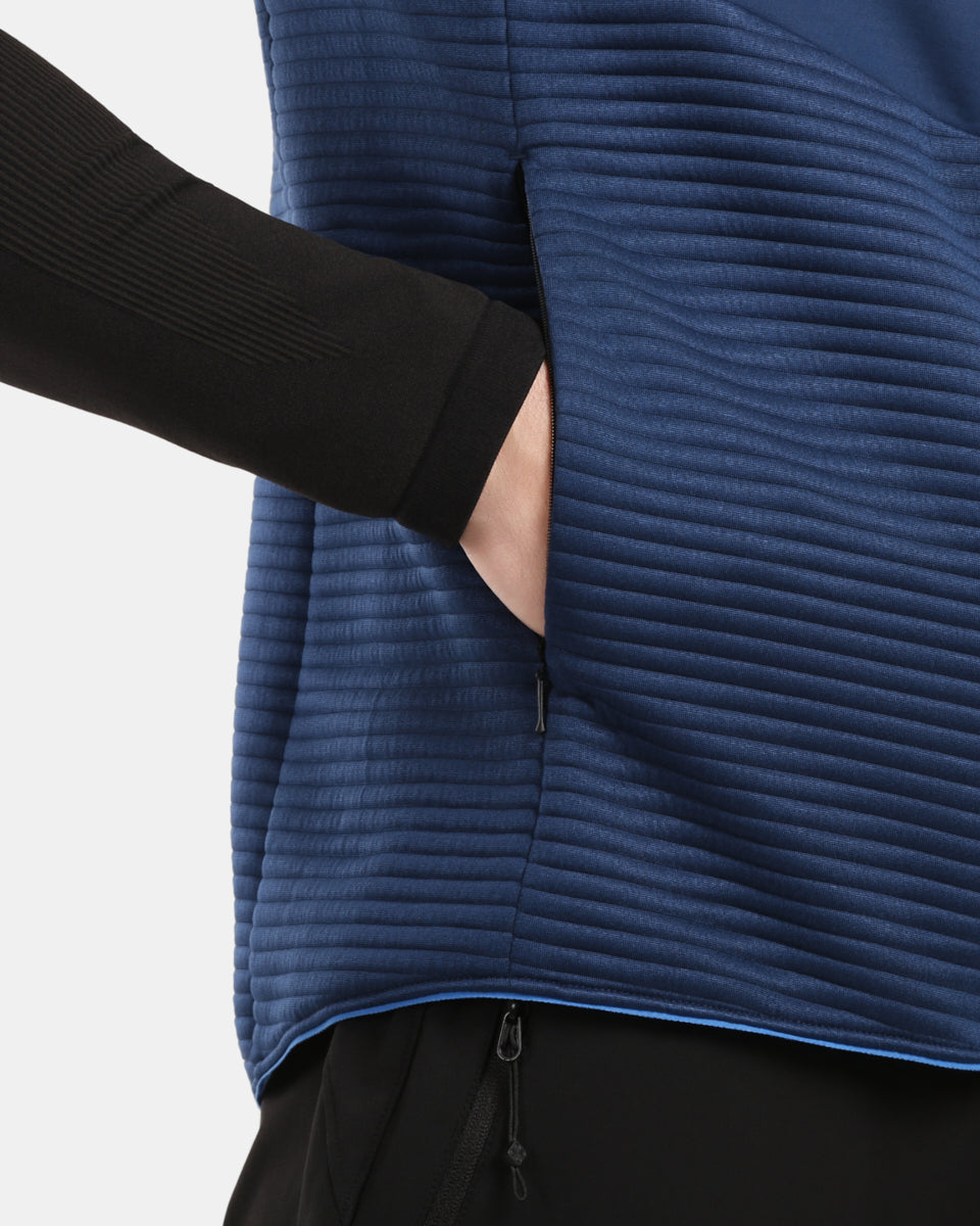 - The vest features two main side pockets and one chest zip pocket for secure storage of small items.